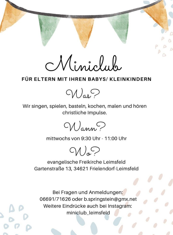 Jeden Mittwoch sind Eltern, Großelteren und Kinder bis 5 Jahren herzlich zum Miniclub eingeladen. Basteln, singen, Geschichten hören und sich miteinander austauschen rundet das vielfätige Programm ab.