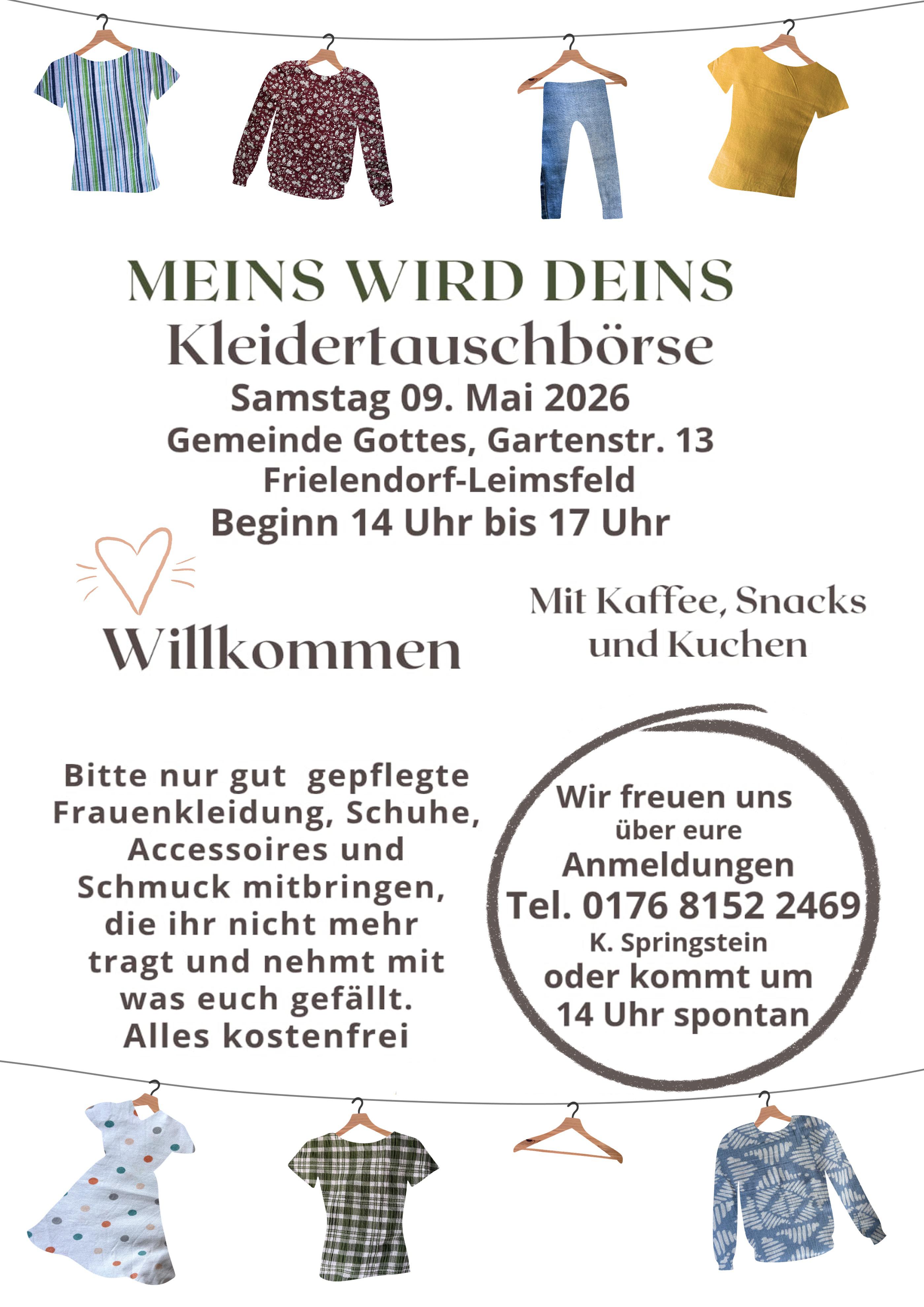 ein Kleidertauschtreffen am 9. Mai um 14 Uhr - 17 Uhr an.